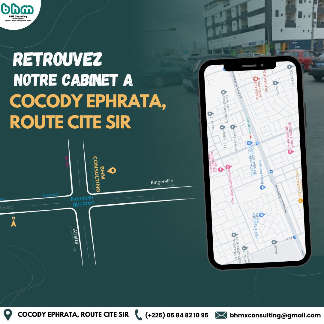 Nos coordonnées Adresse Cocody Nouveau Goudron, Route cité SIR en Face de la CITE CADUCEE DES ANGES – Abidjan, Cote d’Ivoire Email contact@bhmconsulting-ci.cominfos@bhmconsulting-ci.com Téléphone +(225) 05 03 83 07 79+(225) 01 73 87 37 99 Envoyez un message